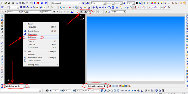 ז. פיצול מסך לאו דווקא נועד עבור הרנדר (עבור מצב DEFAULT). ניתן לבצע פיצול מסך ולכוון את שני חלקי הפיצול לתת-מצב MODELING, וכך לעבוד על מודל קיים בשתי זוויות שונות בזמן שרטוטו.