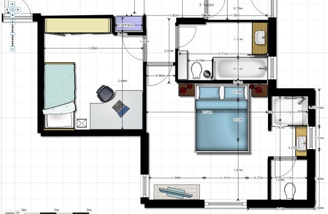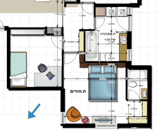 2. מבנה יחידת ההורים לא אופטימלי. היחידה גדולה וניתן לסדר אותה בצורה אחרת, נוחה יותר. כדאי לרווח קצת את חדר הרחצה והארונות. אולי ארון קיר אחד גדול. הטלוויזיה נמצאת ממש מול החלון. כדי לצפות בה בשכיבה במיטה היא צריכה להיות גבוהה וזה לא ניתן כשיש שם חלון.