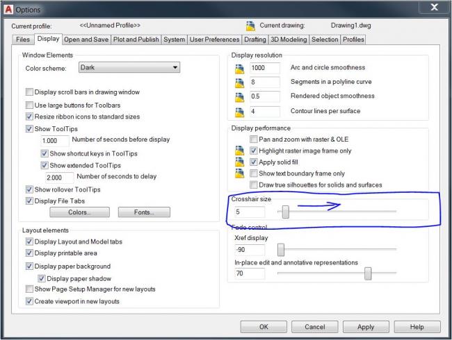 Options>Display לפי התמונה המצורפת: בברירת המחדל, ערך של 5 שהם 5% מגודל המסך ועד 100% שיראה crosshair בגודל מלא על כל המסך