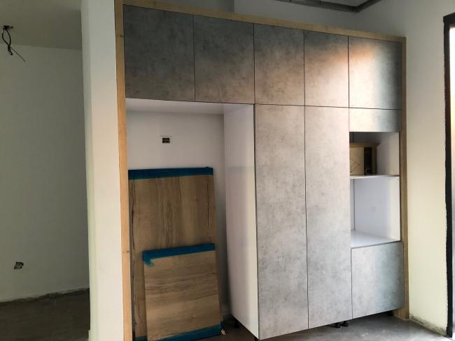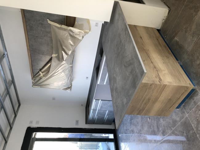 יש טרנד חם של דמוי בטון ועץ ונראה שהמטבח חתר לשם..