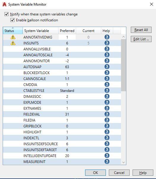 כשהמשתנים כולם שומרים על הערכים כפי שנקבעו מלכתחילה, הכפתור כלל לא מופיע ב-Tray של AutoCAD, אך אם תפתחו קובץ ובו אחד המשתנים שונה מהמקור, ב-2019 , תקבלו הבהוב של הכפתור ב-Tary- ובתוכו מספר המתריע על משספר משתני המערכת שהשתנו.