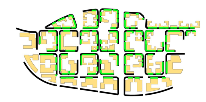 - בינוי מלווה רחוב המגדיר היטב את חללי הרחוב (בניגוד לבניינים מנותקים ובודדים על השטח) יוצרים תחושה נעימה של הליכה לאורך חזיתות של בניינים ומגדירים היטב את הרחוב.