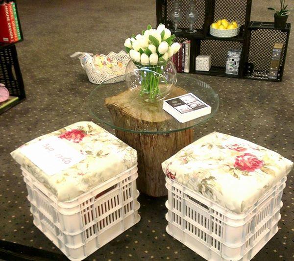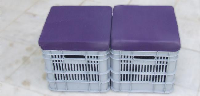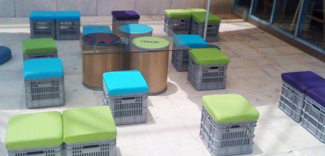 יצרנו פינת ישיבה צבעונית מחומרים ממוחזרים, השתמשנו בארגזי תנובה עשויים פלסטיק ששימשו בסיס למושב שרופד בבדים צבעוניים. המטרה היתה להשתמש בחומר קיים וזמין וליצור אובייקט פונקציונלי חדש. האובייקט הסופי מורכב ממודולים בודדים שכאשר מחברים מס' יחיד