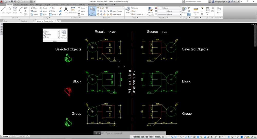 מדירה אחת כדי שיוכלו לעשות ממנה תמונת ראי. הנטיה הטבעית היא לכלול ב-Block כמה שיותר אינפורמציה כדי שאם המקום ישתנה כך גם ההעתק. במסגרת הנטיה הטבעית, הארכיטקט יכלול כיתוב ומידות ב-Block של הדירה המקורית. בעיה: Block אשר יכלול כיתוב ומידות לא יכבד את היכולת של AutoCAD להתעלם מתמונת ראי בכיתוב ובמידות. פתרון: בכללי אין! הפתרון היחיד הוא מעבר מ-Block ל-Group. האופציה של Group נועדה בדיוק כדי לפתור את העניין הזה. ב-Video אפשר לראות את השימוש הפשוט והאינטואיטיבי ביותר ב-Groups כדי לתת מענה ש-Block לא יכול לתת.