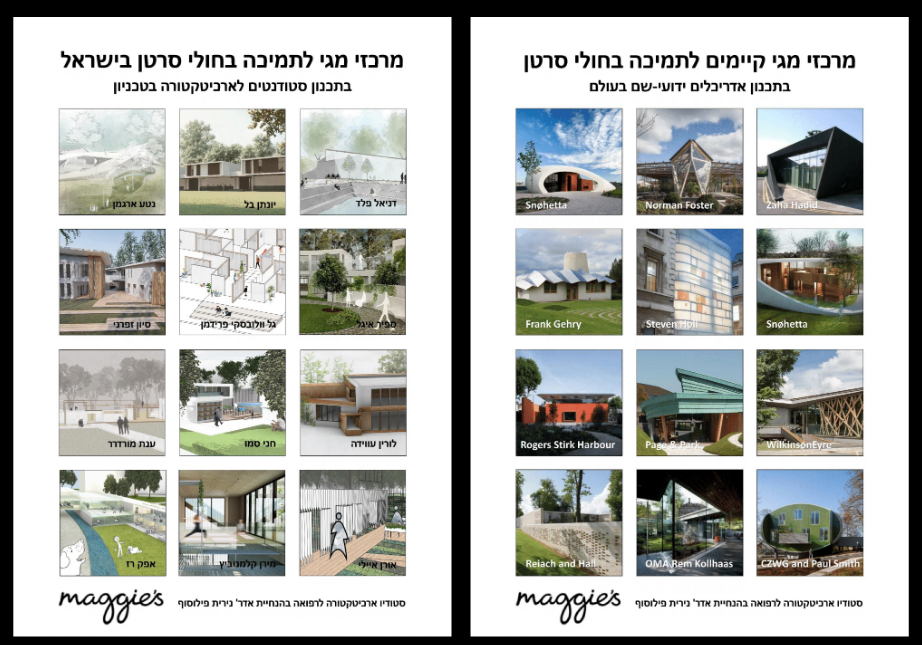 בפקולטה לארכיטקטורה ובינוי ערים בטכניון נפתחה החודש תערוכת עבודות סטודנטים המסכמת את הקורס "ארכיטקטורה לרפואה". בתערוכה מוצגות עבודות מהסטודיו האדריכלי לתכנון מרכז תמיכה לחולי סרטן בישראל בהנחיית אדר' נירית פילוסוף.