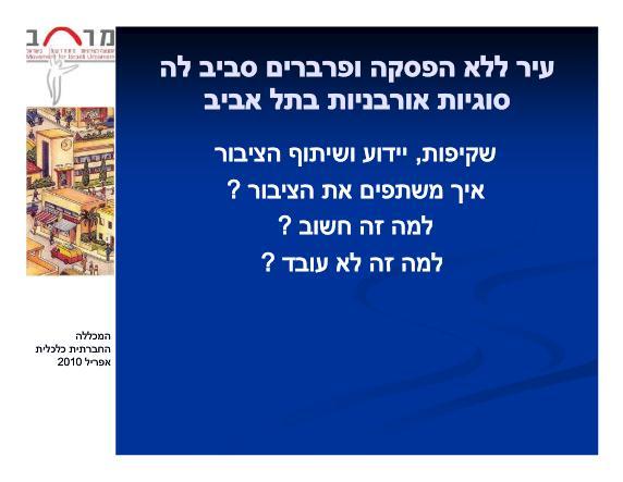 ההרצאה השניה - שיתוף הציבור בתכנון ותהליכי שאררט , הרצאתה של עירית סולסי על שיתוף ציבור