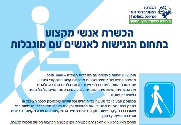 ביום ראשון, 4 ספטמבר 2011, יפתחו במרכז האוניברסיטאי אריאל קורסים נוספים להכשרת מורשים לנגישות מבנים תשתיות וסביבה ומורשים לנגישות השירות. הקורסים פתוחים בפני אנשי מקצועות התכנון הפיזי והחברתי, ומקצועות הבנייה והאדריכלות שצברו לפחות שלוש ניסיון מקצועי בתחומם מיום קבלת הדיפלומה או הרישום בפנקס המהנדסים והאדריכלים או ההנדסאים במדור בנייה ואדריכלות.