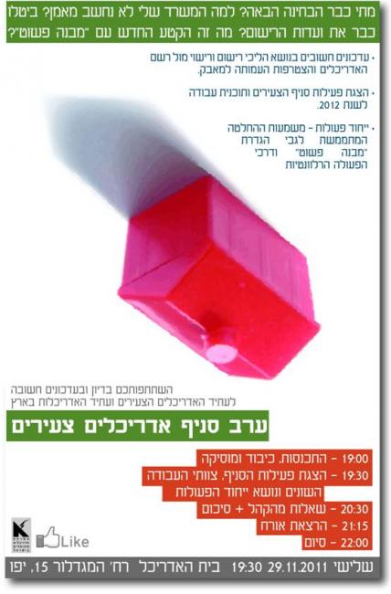 מתי כבר הבחינה הבאה? למה המשרד שלי לא נחשב מאמן? ביטלו כבר את ועדת הרישום? מה זה הקטע החדש עם "מבנה רשום? על כל אלה ועוד יערך דיון של סניף האדריכלים הצעירים של עמותת האדריכלים ביום שלישי, 29 נובמבר 2011, 19:30 בבית האדריכל, רחוב המגדלור 15, יפו.