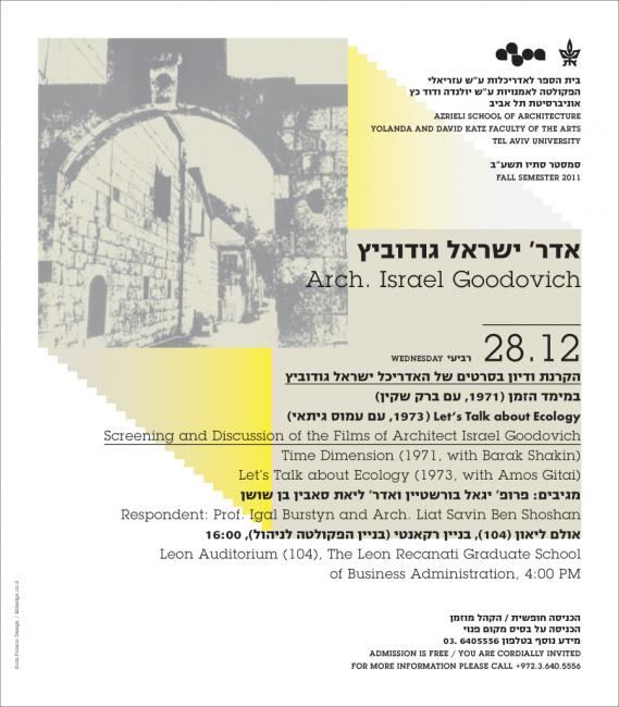 נערוך הקרנה של סרטיו של האדריכל ישראל גודוביץ' "במימד הזמן" משנת 1971 אותו עשה יחד עם ברק שקין. בנוסף יוקרן הסרט "Let's talk about Ecology" משנת 1973 אותו עשה יחד עם עמוס גיתאי .