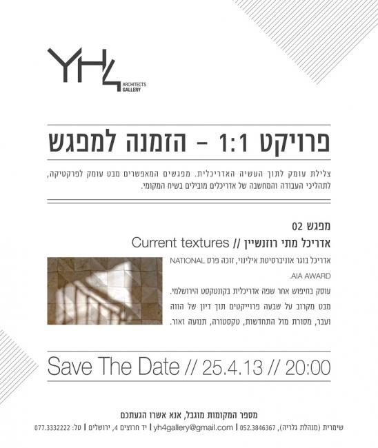 גלריה YH4 שמחים להזמינכם למפגש שני בסדרת :"פרויקט 1:1" צלילת עומק לתוך העשייה האדריכלית העכשווית. מפגש מקרוב עם אדריכל מתי רוזנשיין העוסק בבניה מרקמית בירושלים בנושא: