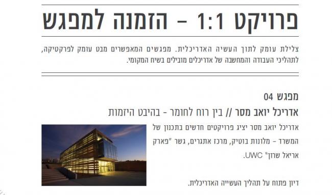 הצגת מגוון פרויקטים חדשים של משרד יואב מסר אדריכלים.במסגרת הצגת תהליך התכנון יועלה לדיון הנושא היזמי של "המעשה האדריכלי". מקומו החדש של האדריכל בחזון הפרויקט מול המערכות הכוללות והתפקיד המסורתי של האדריכל.