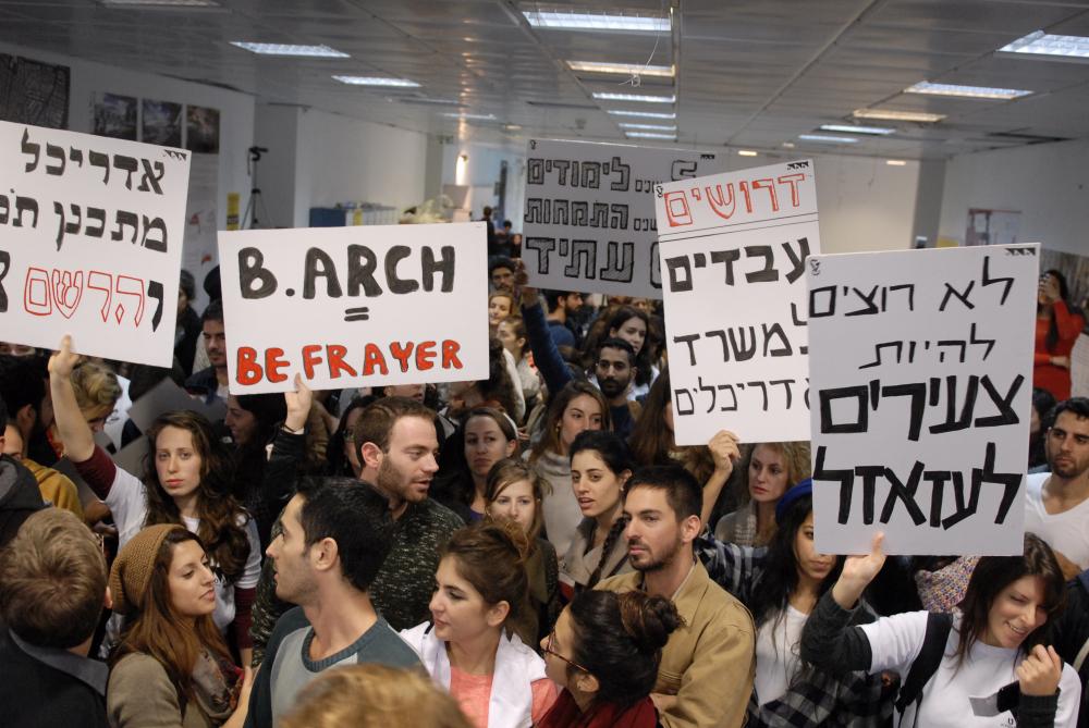 פורום אדריכלים צעירים השבית היום יחד עם התאחדות הסטודנטים ואגודות הסטודנטים בטכניון, אוניברסיטת תל אביב, אוניברסיטת אריאל, בצלאל ומכללת ויצ"ו, את חמשת הפקולטות לאדריכלות בישראל במחאה על ההתעלמות המתמשכת של משרד הכלכלה מהניצול המחפיר של המתמחים באדריכלות.