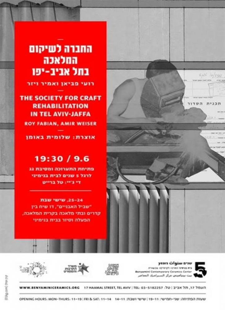 האמנים רועי פביאן ואמיר ויזר ישיקו בגלריה העליונה את התערוכה "החברה לשיקום המלאכה בתל אביב-יפו". בתערוכה שאוצרתשלומית באומן מציגים פביאן וויזר מייצב מחקרי-לירי באסמבלאז' של שלושה אלמנטים פיסוליים שעוסקים בהיסטוריה האדריכלית-יצרנית-חומרית של קריית המלאכה. לצידה בגלריה התחתונה תיפתח התערוכה "משכפלת, חפצים יוצרים חפצים", שאצרו ועיצבו נעמה שטיינבוק ועידן פרידמן-סטודיו REDDISH. התערוכה מביאה לקדמת הבמה חפצי שכפול, וחושפת את האמצעים בעזרתם אובייקטים מגיעים לעולם. קריית המלאכה מהווה את הציר המרכזי של שתי תערוכות אלו שמייצרות מבט מורכב המחולק למיקרו ומאקרו. ההתבוננות מתוך המאקרו, מתייחסת לתכנון האדריכלי של קריית המלאכה ולהיבטים החברתיים, הכלכליים והחומריים שהיוו את המסד להקמתה, לעומת אלו המתרחשים בה היום, וההתבוננות מתוך המיקרו, בוחנת את החפצים אשר באמצעותם נוצרים חפצים במרחב התעשייתי, מתוך נקודה של התבוננות פואטית הבוחנת אותם כהרחבות משוכללות של הגוף, ומיקסום יכולת ייצור בסדרות בינוניות.