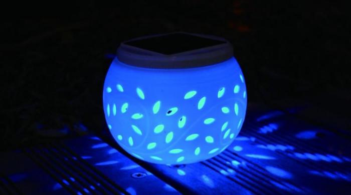 מנורת לד עם צבעים מתחלפים מופעלת על ידי פאנלים סולאריים - מתאים לשימוש בגינה : שולחן, מעקה, גדר ועוד. ניתן לשנות את התוכנית לצבעים מתחלפים או קבוע.