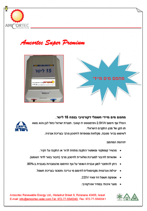 הכולל גוף חימום KW2.5 ותרמוסטט דו קוטבי. תוצרת ישראל כחול לבן והוא נושא תו תקן של מכון התקנים הישראלי.