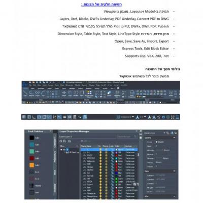 תוכנה תואמת אוטוקאד. בקבצים (dwg, dxf עד וכולל גרסה 2024. ללא המרה!), ממשק משתמש (הגדל/י תמונה מימין), פקודות, בלוקים, פקודות הדפסה ועוד ועוד.