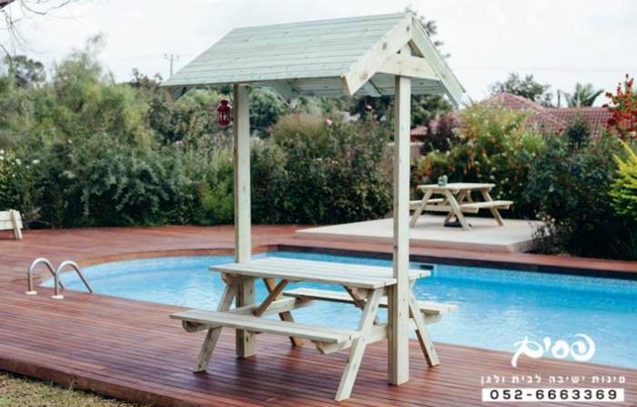 שולחן קקל מעץ מלא לשמונה אנשים השולחן כולל קירוי מפרגולת עץ מעוצבת בהתאמה מושלמת
