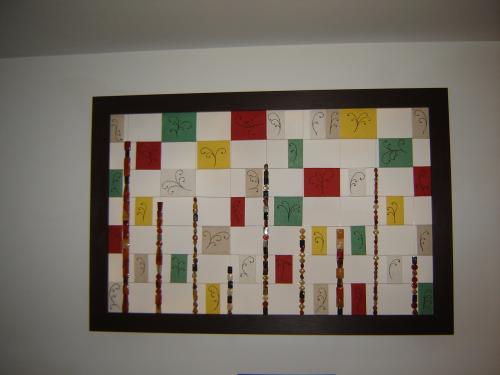 לרוחבה ולאורכה נמתחו חוטי דיג שקופים בהם נשזרו חרוזים והודבקו ניירות אורז מאויירים.
