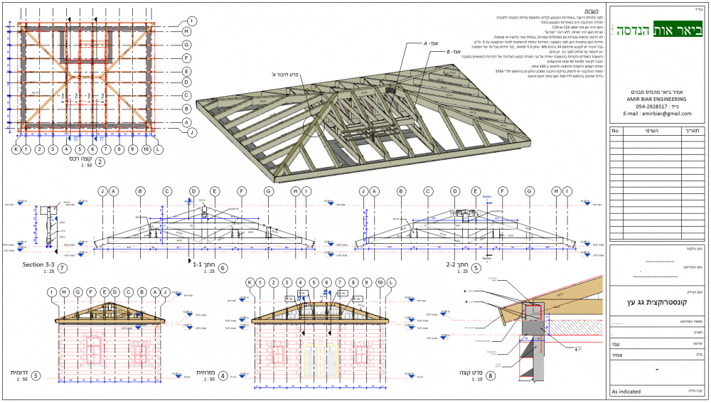 מידול של גג עץ בפרויקט שיקום ותכנית שלד לביצוע כולל פרטים