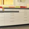 ההתיחסות לשני חדרי הטיפולים כחלל יחודי טכנולוגי מעוצב, מתבטאת בדגש על קוו נקי עם נגיעות צבע קטנות המחברות את חדרי הטיפולים לחלל ההמתנה. שיש בגוון אפור מחדד את הקו האופקי, שילוב פורמייקה לבנה עם טקסטורה מפוקסלת נותנים את הטון בחדר ומחברים את משטח העבודה ויזואלית לריצוף.