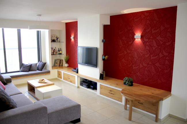 נישת גבס תוכננה על 2 קירות, בשילוב משטחים מעץ אלון ומדפי זכוכית, טפט אדום מדהים ונועז מקשט את הקיר הראשי בסלון, נישת הגבס יוצרת גם ספסל, מתחת לחלון, שמשקיף על הנוף העירוני, מתחתיו יש מקום אחסון נוסף. את הטפט מאירים גופי תאורה מלדים. השלמנו את העיצוב עם ריהוט משלים הכולל ספה 4 מושבית אפורה, הדום המהווה מושב נוסף לעת מצוא וכריות צבעוניות בעיטור אתני המזכיר קצת את דוגמת הטפט, שולחן סלוני מעץ אלון המשלב גם הוא אחסון ושולחן פינת אוכל עגול, שמעליו תלוי גוף תאורה אדום בסגנון רטרו. ולבסוף, שולחן חצי עגול עבור הילדות, מתחבר לנישת הגבס ומהווה שולחן משחק לילדות ומשתלב בעיצוב הכללי.