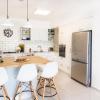 המטבח נעשה ע"י הנגר שאנחנו אוהבים לעבוד איתו, כשהאי משמש לישיבה של 5 אנשים ואחסון נוסף. הארון העליון והאי נצבעו בגוון תכלת ונותנים נגיעה של צבע. לצד המטבח, באיזור הכניסה יצרנו נישה עבור ארון כניסה המשמש לאחסון מעילים תיקים ונעליים, כשבמרכזו מגירה לאחסון מפתחות ומכתבים.