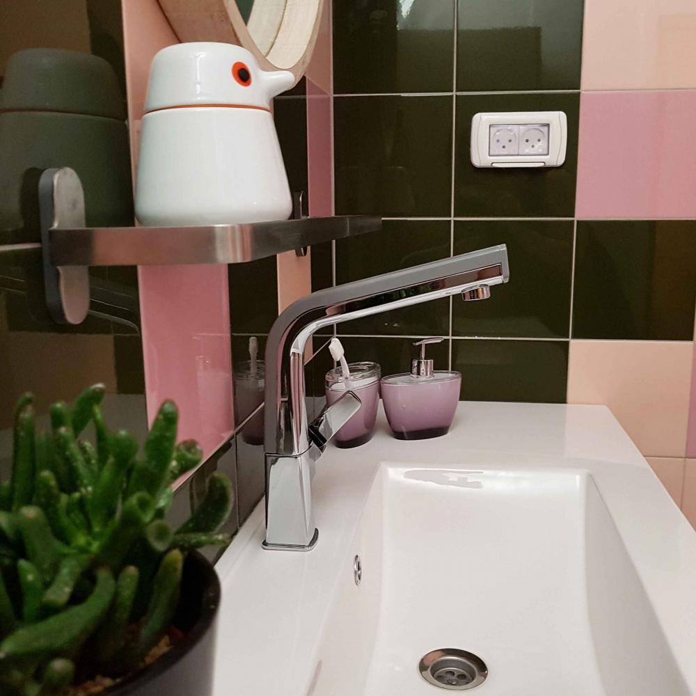 עיצוב חדר רחצה ילדים בבית פרטי התחיל מבקשת הלקוחות להשתמש בשילוב צבעים לא שגרתי - ורוד וירוק. למשפחה ארבעה ילדים, שני בנים ושתי בנות, וחדר הרחצה מיועד לשלושה מתוכם, שתי אחיות ואח. שני גוונים של ורוד נבחרו עבור הבנות, ירוק בקבוק נבחר עבור האח המתבגר. שילוב של אריחים מבריקים צבעיניים ולא גדולים, אלמנטים של צמחייה ואביזרים עשויים מעץ מייצר אווירה פריזאית.