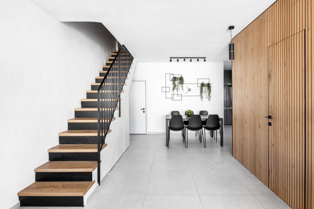 החלפנו את הריצוף בקומת הכניסה לריצוף בהיר בגוון חול ים. החלפנו את חיפוי המדרגות לחיפוי שמשלב שחור לרום, ואלון מבוקע למדרך. התקנו מעקה מברזל בצבע שחור וקווים ישרים.