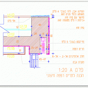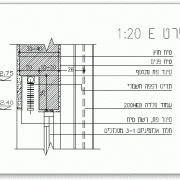 11.09.07חתך אנכי בקיר הכולל כיס לתריס רפפה חיצוני. הכיס עשוי פריקסט בטון בעובי 5 ס\"מ. המסתיר לחלוטין את תא התריס. קצה הקיר העליון משמש כמעקה לסגירת הגג וכולל קופינג עם פס ניתוק מהטיח. חלון האלומיניום מותקן בצידו הפנימי של הקיר בגובה תקרת הגבס. -