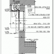 27.07.11סט פרטי בנין ובהם חלון פרופיל בלגי כולל מסגרת ברזל ותריס משרביה מברזל בחיתוך לייזר. הקיר בו מותקן החלון מחופה אבן מצידו החיצוני וגבס מצידו הפנימי. החלון נתון במסגרת פח פלדה 3 מ"מ. בפרטים מוצגים חתכים בנקודות שונות בחיבור החלון אל הקיר ואל הרצפה.
