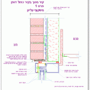 28.04.07שרטוט עקרוני של קיר דופן כפולה ובו חלק הבנוי כקיר מסך - פרט חיבור משקוף צד בקיר המסך אל הקיר המחופה לבנים, כולל פתרון לאיטום נגד מים. -